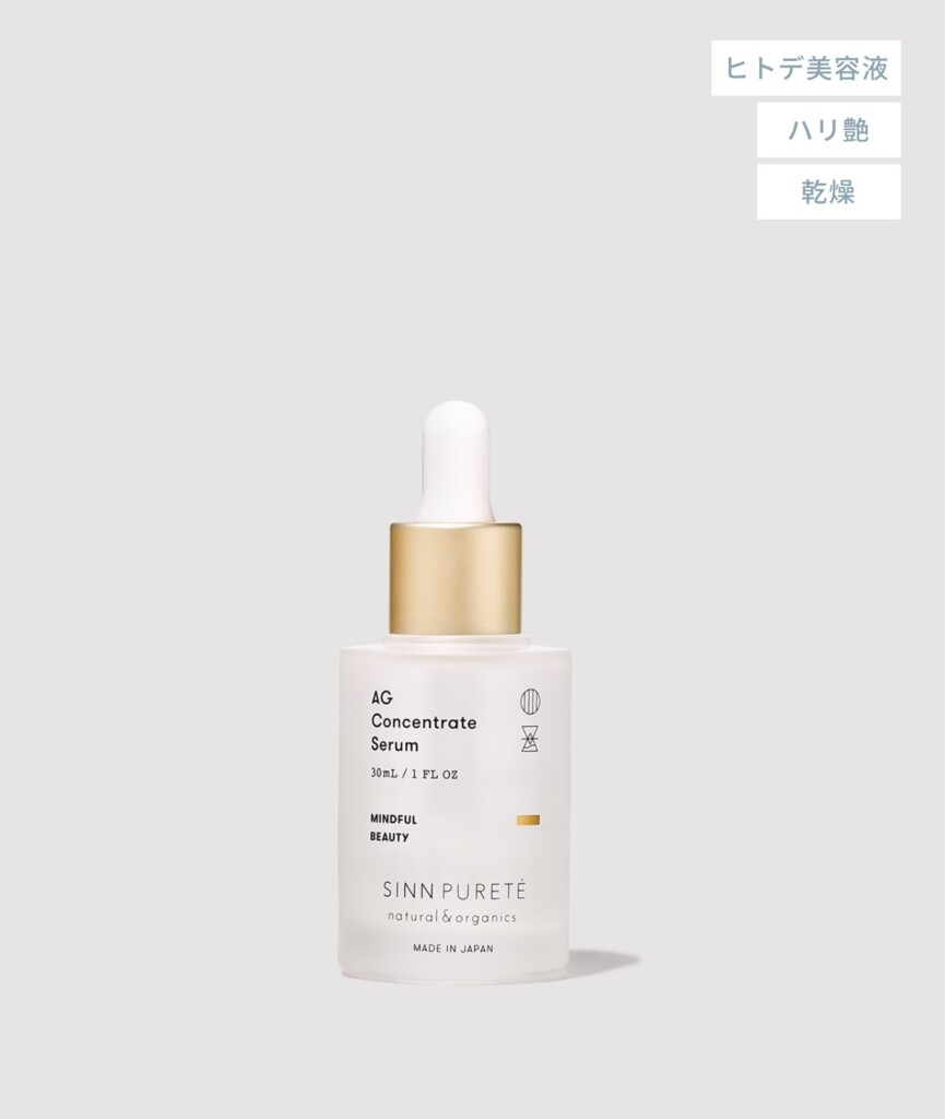 AGコンセントレイト セラム a:ヒトデエキス(ジュベンタイド)を高濃度配合し、ストレスによる肌荒れや乾燥にアプローチ。ハリと透明感をサポートし、芯から活き活きとした肌へ導きます。糸を引く粘度の高さながら高浸透で、内側から潤う使用感が特徴です。