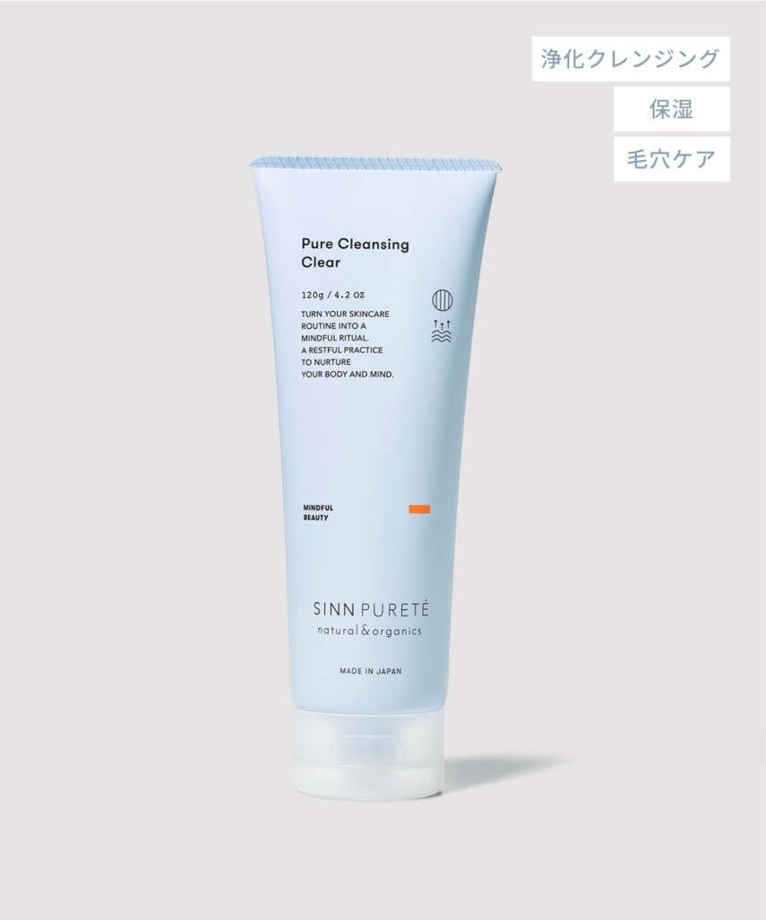 ピュアクレンジング クリア:天然由来成分99%で肌に優しい、ジェルとオイルのクレンジング力を融合したハイブリッド型浄化クレンジング。メイクと混ざるとジェルがオイルへと滑らかに変化し、大気汚染物質までしっかりオフしながら、肌のバランスを整えます。一日のメイク汚れをリセットし、つるんと澄んだピュアな肌へと導きます。 今この瞬間に意識を集中させ、心まで浄化する、マインドフルなクレンジングタイムを実現します。
