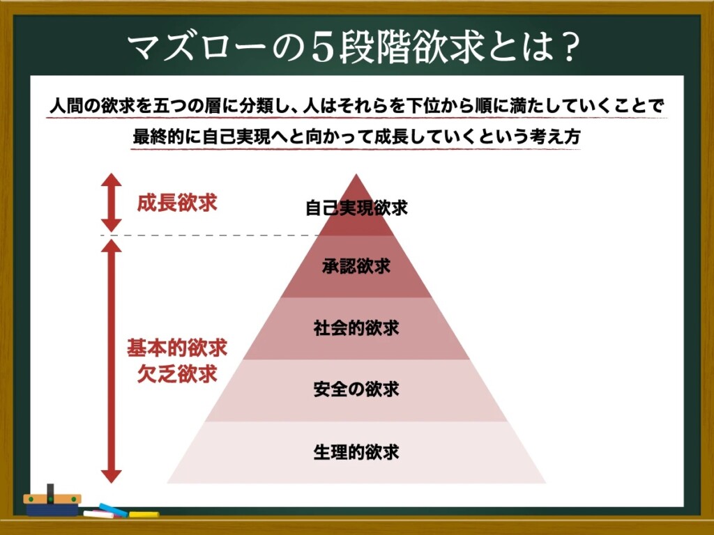 マズローは、生理的欲求や安全欲求など、不足を埋めるための動機を「欠乏欲求」と呼びました。